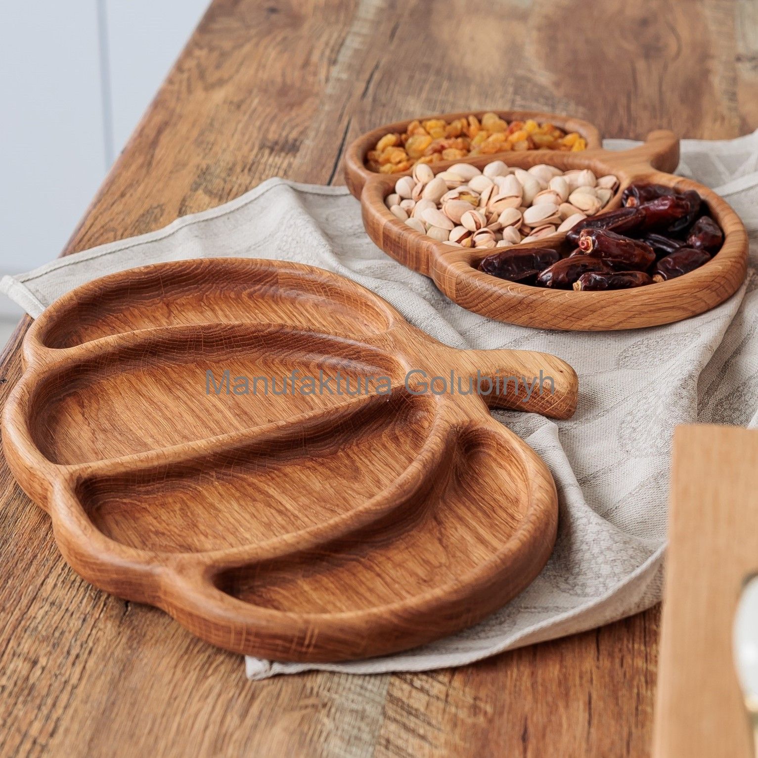 Менажница выполнена вручную из дуба, может отличаться насыщенностью цвета и оттенком.