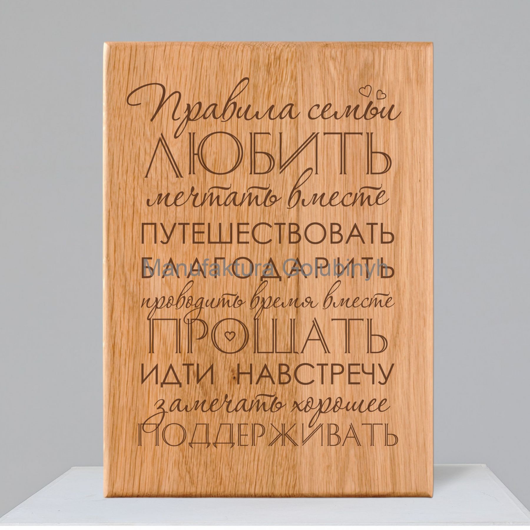 На фотографии изображен макет будущей гравировки. Доска выполнена вручную из массива дуба, может отличаться насыщенностью цвета и оттенком.